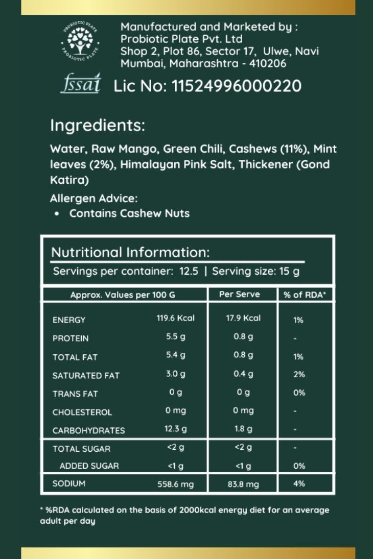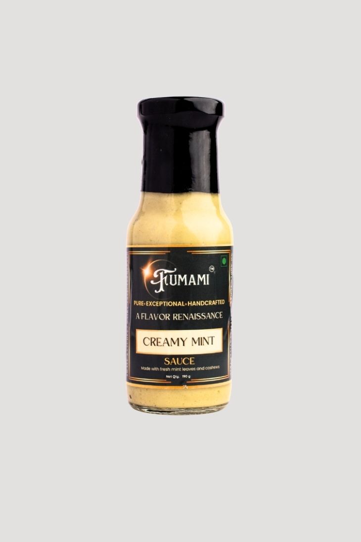 Creamy Mint Sauce is a zesty blend of creamy cashews, tart green mango, fresh mint, and fiery chilies. The sauce bursts with the bright, tangy sharpness of green mango, complemented by the cool, herbaceous freshness of mint. Creamy cashews add a rich, nutty smoothness, rounding out the flavors with a velvety finish.